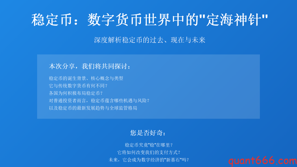 大家好,我是野生量化员!今天,我们共同探讨一个在数字货币世界中扮演着“定海神针”角色的重要概念——稳定币。它不仅是连接传统金融与数字经济的桥梁,更是未来数字经济发展不可或缺的基石。本次分享,我们将深入剖析稳定币的过去、现在与未来,希望能为大家带来全面的理解和启发。