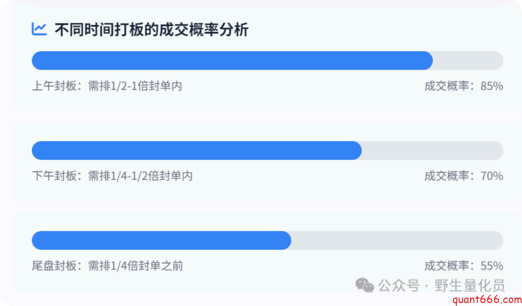 尾盘封板后的打板: 当个股在尾盘( 通常是下午2点后) 才封板时 , 由于临近收盘 , 资⾦ 在次⽇的承接⼒往往较强。 根据的分析 , 下午封的板 , 你可能需要排在1/4-1/2倍封单内, 成交概率才更⼤些 , 若是尾盘下午2点半后才封板的话 , 可能需要排在1/4之前了。 这种情 况下 , 投资者需要提前预判个股的封板可能性 , 并做好排队准备。